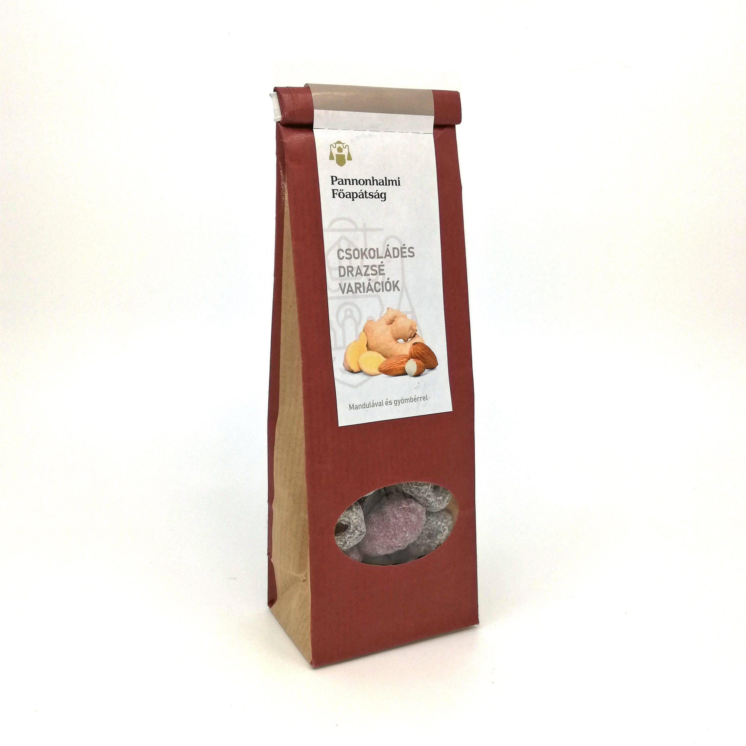 Étcsokoládéba mártott kandírozott gyömbérdarabok és feketeribizlis fehércsokoládéba mártott pirított mandula. Pannonhalmi Főapátság és a Harrer Csokoládémanufaktúra drazséválogatása