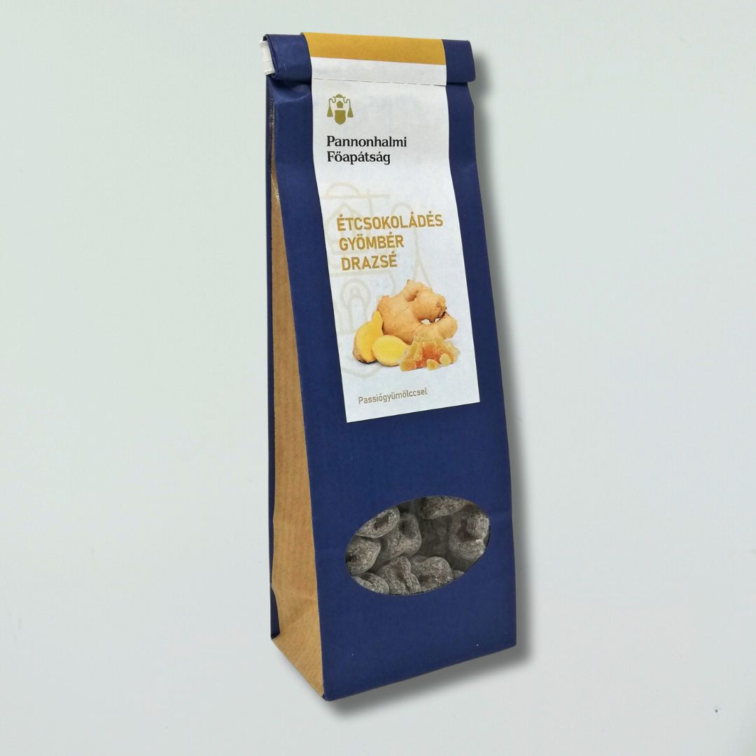 Étcsokoládéba mártott kandírozott gyömbérdarabok. A Pannonhalmi Főapátság és a Harrer Csokoládémanufaktúra drazsékülönlegessége