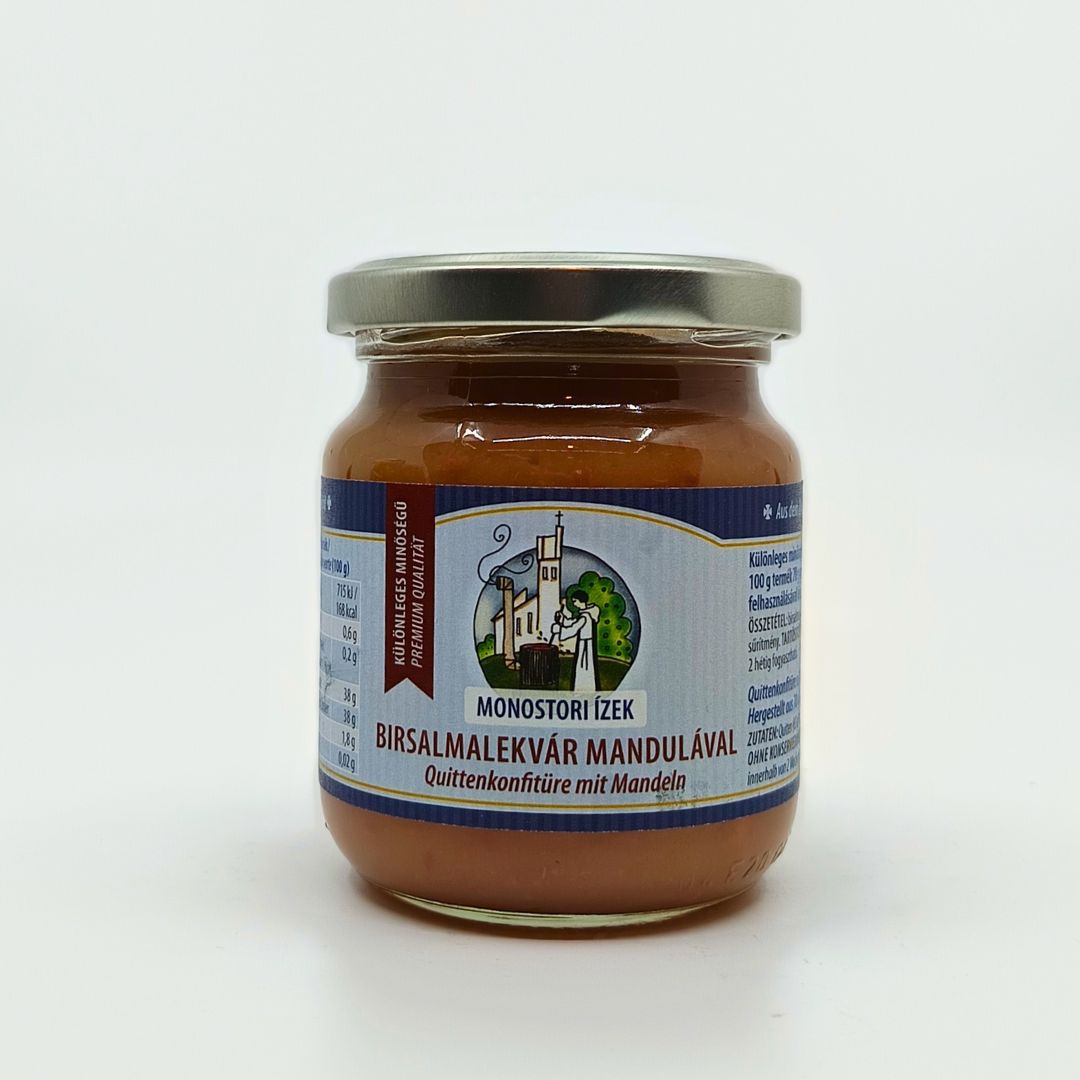 A Ciszterci Monostorban készült Exclusive birsalmalekvár mandulával egy elegáns, kézműves gyümölcslekvár. A birsalma karakteres zamata találkozik a pirított mandula lágy, diós aromáival — így minden kanál egy igazán különleges, prémium ízélményt nyújt. Ez a különleges lekvár a monostori gasztronómiai hagyományokra épülő recept alapján készül. Gondosan válogatott alapanyagokból, hogy a gyümölcs és a mandula harmonikus együttese tökéletesen érvényesüljön.