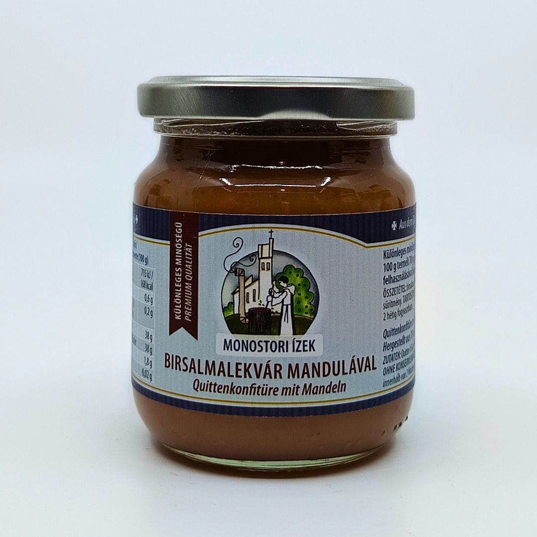 Elegáns ízkombinációt kínáló birsalmalekvár, finom manduladarabokkal gazdagítva. A birsalma karakteres savassága és a mandula lágy textúrája harmonikus egységet alkot. Különleges gasztronómiai élmény, amely a monostori kézművességet tükrözi.