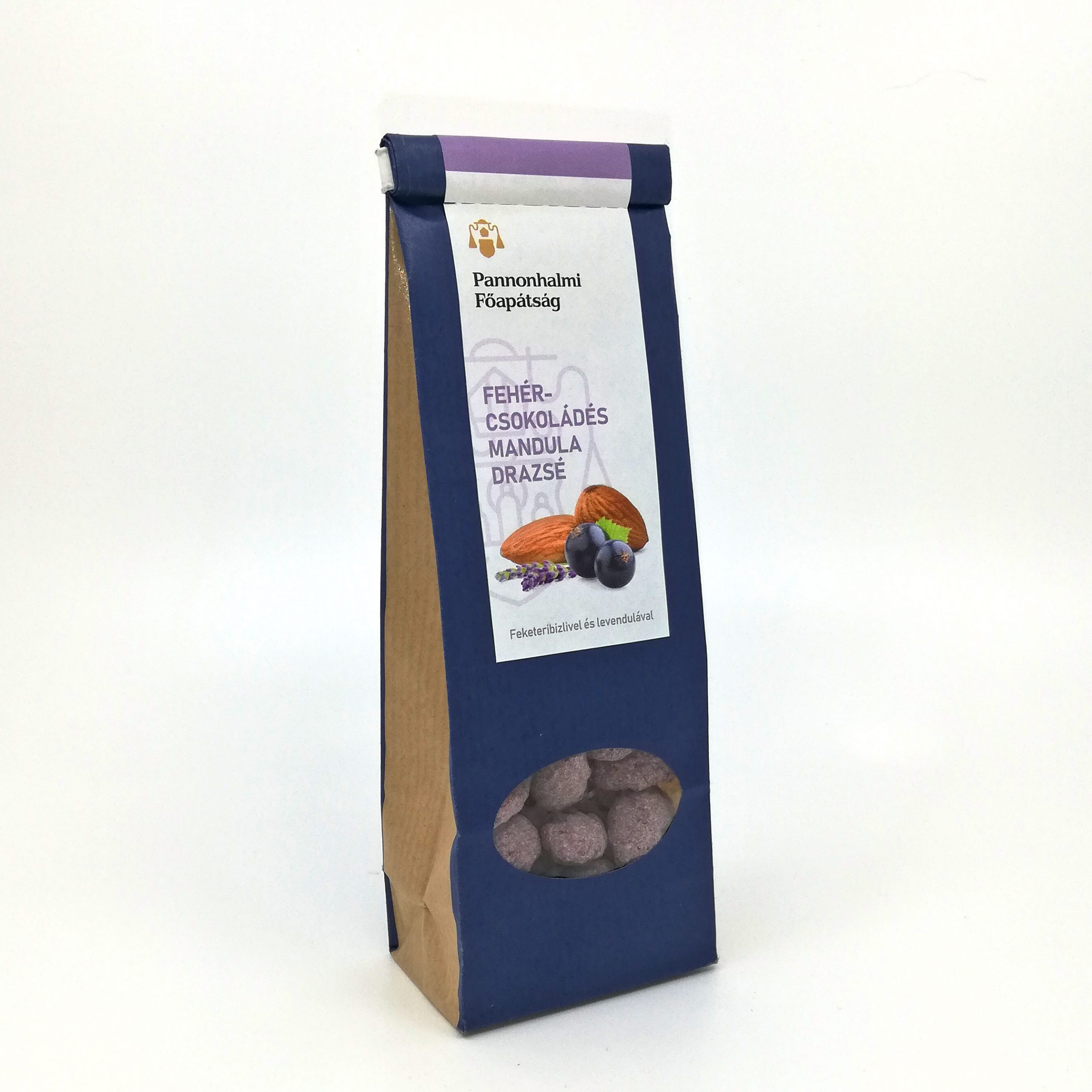 Feketeribizlis fehércsokoládéba mártott pirított mandula. A Pannonhalmi Főapátság és a Harrer Csokoládémanufaktúra drazsékülönlegessége