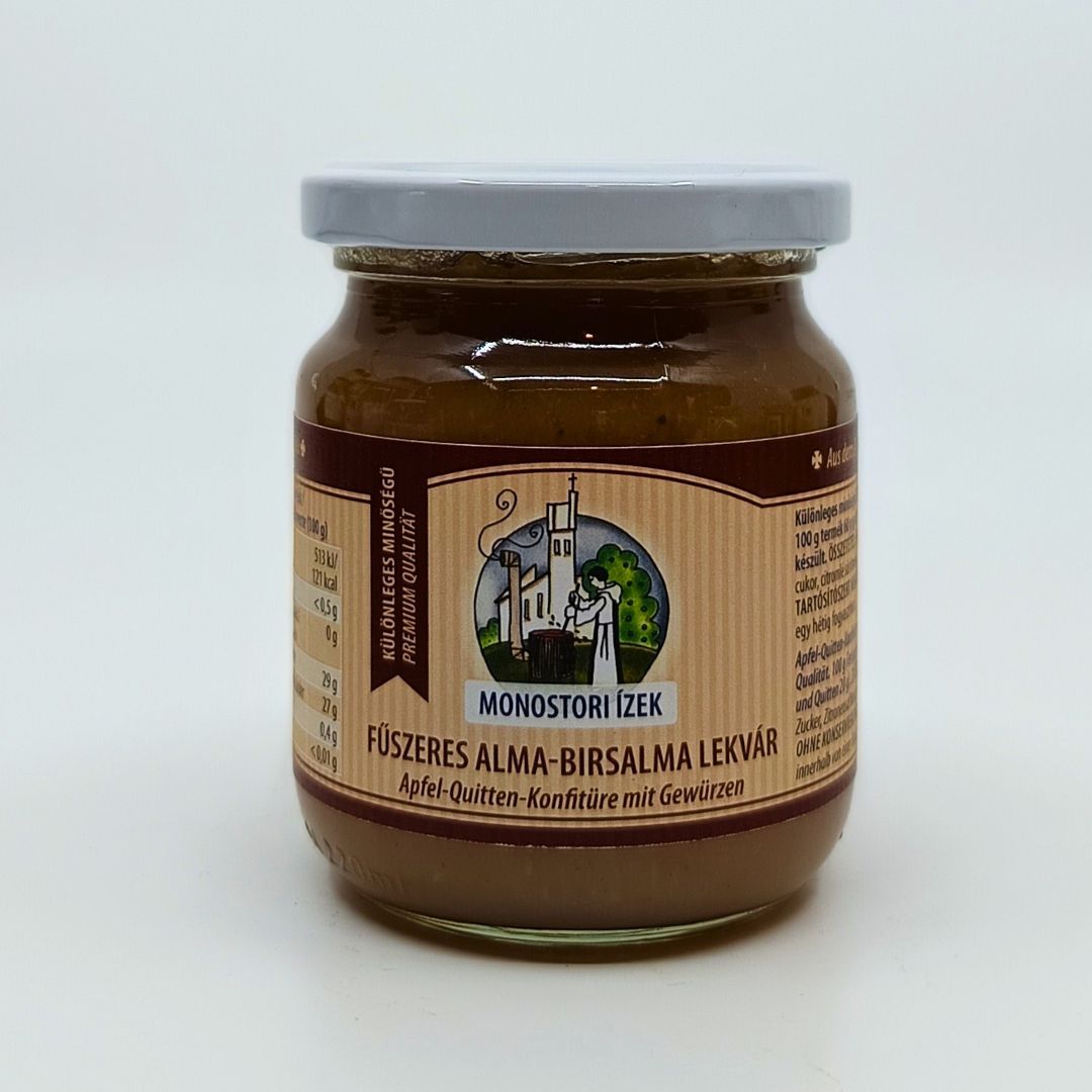 Alma és birsalma harmonikus párosítása, finom fűszerekkel kiegészítve. Meleg, otthonos ízvilága kiváló süteményekhez, reggelikhez vagy sajtok mellé. Gondosan összeállított receptúra a monostori konyha szellemiségében.