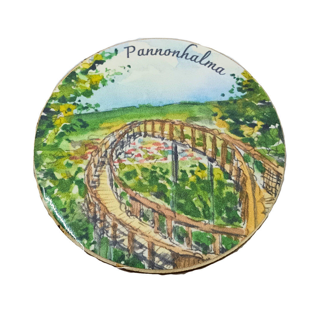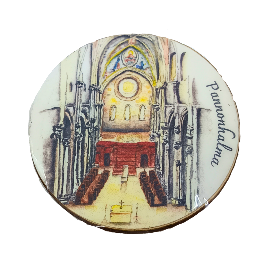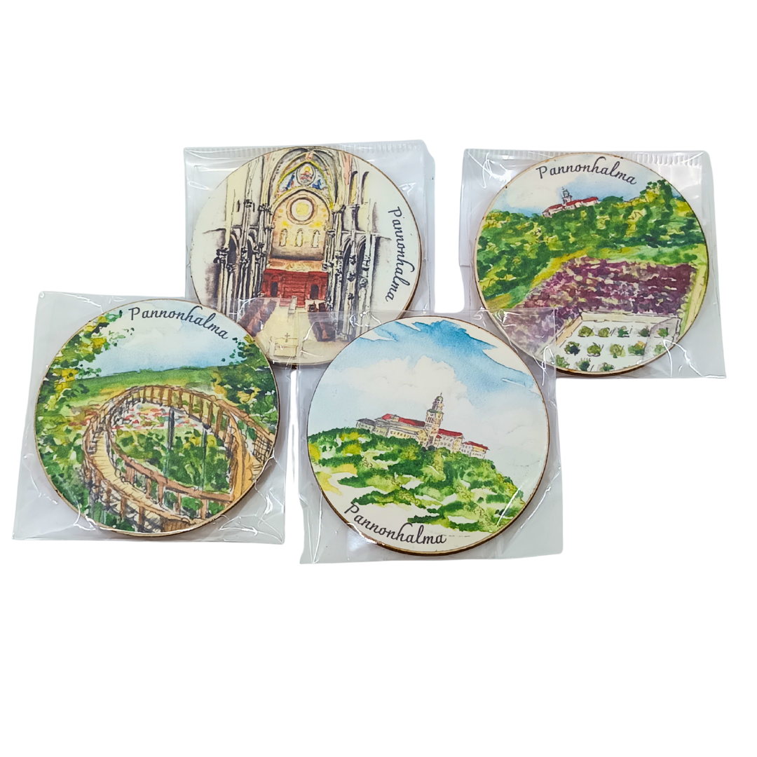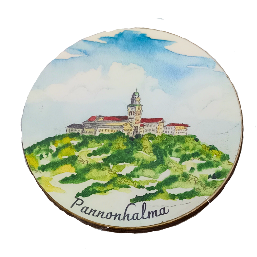 Egyedi, kör alakú, kézzel készített és festett fa hűtőmágnes, amely a Pannonhalmi Főapátság emlékét viszi otthonodba. Stílusos ajándék vagy kedves emlék a bencés hegytetőről.