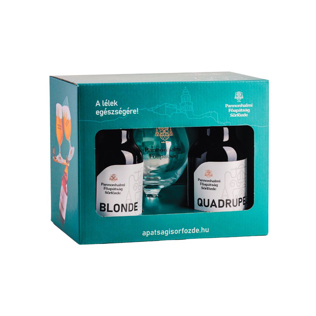 Díszdobozos sörválogatás egy világos és egy barna típusú belga sörrel, gravírozott apátsági söröspohárral