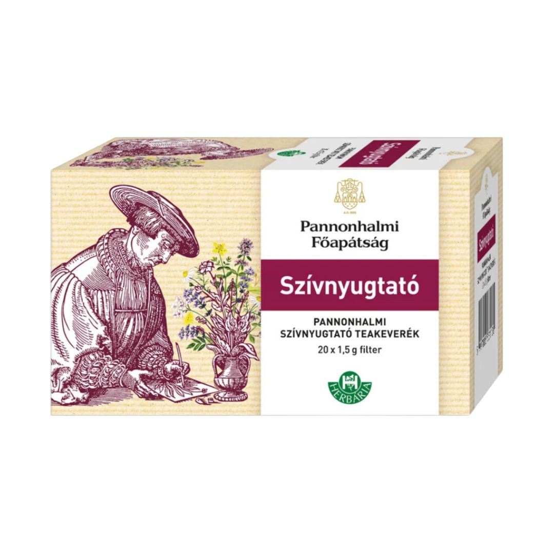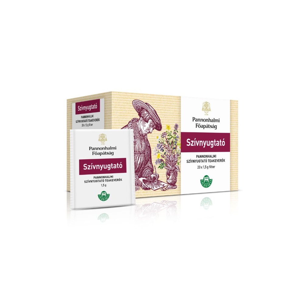 A gyógynövények a legrégebben használatos alapanyagok a népi gyógyászatban, hatásuk bizonyított, a bencés rend számos feljegyzést, receptet őriz ezzel kapcsolatban. Meghatározott keverékük speciális problémákra jelenthet megoldást. Most a Pannonhalmi Főapátság bencés szerzeteseinek évszázados gyógyászati, gyógynövényes tapasztalata találkozik a Herbária Zrt. szakértelmével 12 gyógyhatású teakeverék formájában. Minőség, szakértelem és tradíció melyek jellemzik ezeket a termékeketStressz, idegesség, kimerültség — mindennapi életünk velejárói. A szívnyugtató teakeverék túlterheltség és kimerülés okozta, valamint időskori és ideges eredetű szívpanaszok csökkentésére, kezdődő magas vérnyomás enyhe eseteiben, anginás panaszok fellépésekor kúraszerűen alkalmazható kiegészítő terápiára – a panaszok megszűnéséig. A doboz tartalma 20 db filter (20 x 1,5 g).Szívből ajánljuk mindenkinek aki panaszait a legősibb módon a természet erejével szeretné enyhíteni!Összetevők listája (1 filter tartalma): 0,06 macskagyökér [Valeriana officinalis L.; radix], 0,36 g galagonya virágos hajtásvég [Crataegus spp.; folium cum flore], 0,36 g szúrós gyöngyajak virágos hajtás [Leonurus cardiaca L.; herba], 0,36 g orvosi citromfű leveles szár [Melissa officinalis L.; herba] és 0,36 g fehér fagyöngy leveles hajtás [Viscum album L.; herba] aprított formában.