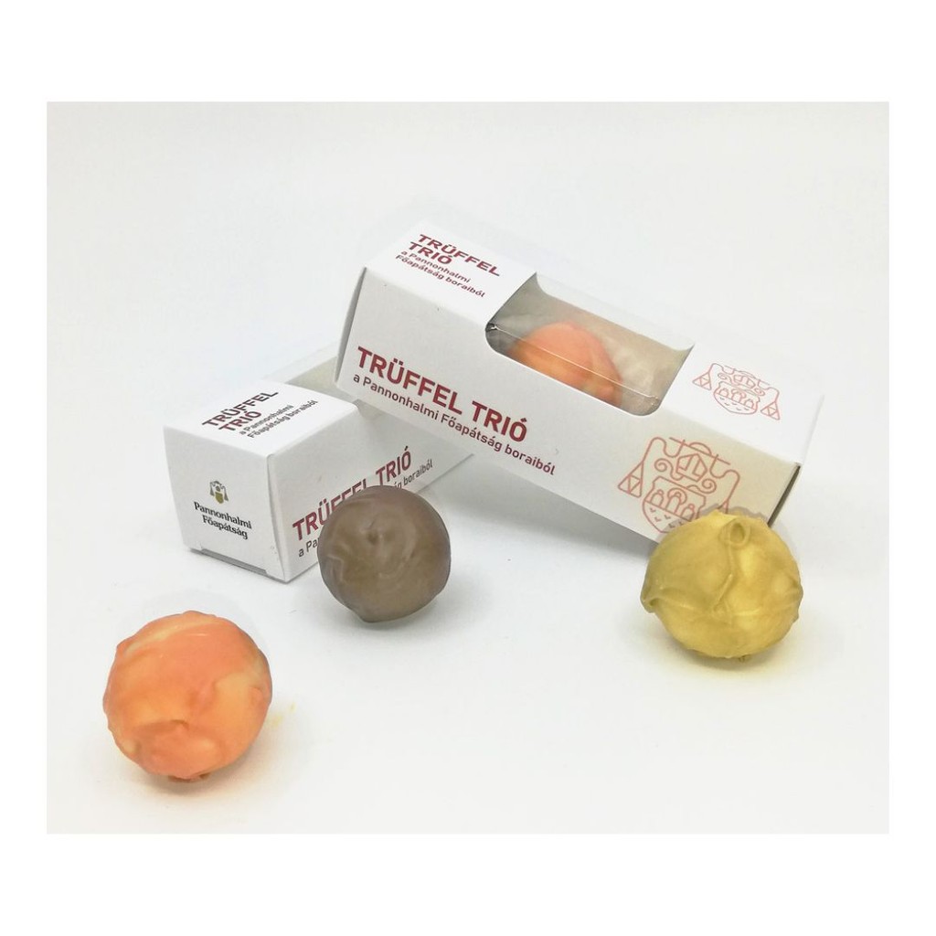 A Pannonhalmi Főapátság csokikínálatában igazi különlegességnek számítanak a trüffelek. A minőségi csokoládék és a kiváló borok találkozásának eredményeként háromféle kellemesen roppanós trüffelgolyót alkottunk, amelyek belsejébe lágy csokoládés-boros-gyógynövényes krémet töltöttünk.A csomag tartalma: Fehérboros trüffelgolyó: Fehércsokoládé Rajnai Rizlinggel, mentával és citromfűvel; Rozéboros trüffelgolyó: Fehércsokoládé Tricollis Roséval és eperrel; Vörösboros trüffelgolyó: Étcsokoládé Pinot Noirral . A válogatásban szereplő mindhárom trüffel golyó elérhető webshopunkban külön-külön is.Szeretettel ajánljuk mindenkinek, aki nem tud/nem szeretne választani a három ízvilág között!Összetevők listája: Fehérboros trüffelgolyó* összetevők: fehércsokoládé (cukor, kakaóvaj, tejpor, emulgeálószer: szójalecitin, vanília), vaj, Pannonhalmi Rajnai Rizling fehérbor, glükózszirup, menta, citromfű Rozéboros trüffelgolyó* összetevők: fehércsokoládé (cukor, kakaóvaj, tejpor emulgeálószer: szójalecitin, vanília), vaj, Pannonhalmi Tricollis rosébor, glükózszirup, eper Vörösboros trüffelgolyó* összetevők: étcsokoládé 60% (kakaómassza, kakaóvaj, cukor, emulgeálószer: szójalecitin, vanília), vaj, Pannonhalmi Pinot Noir vörösbor, glükózszirup *Alkoholt és szulfitokat tartalmaz., Nyomokban diófélét, glutént tartalmazhat.